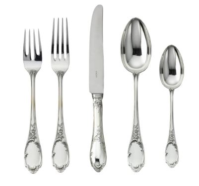 Flatware in silver. Place setting USA 5 pcs: #1 dinner fork; #1 dinner knife; #1 fruit spoon; #1 fish fork; #1 tea and dessert spoon (14 cm).